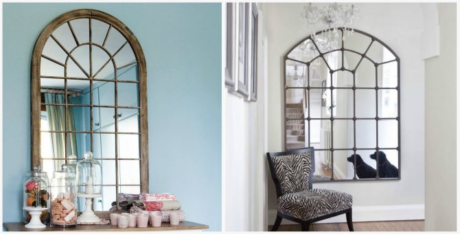 Une technique de conception assez intéressante, dont la tâche principale est d'agrandir visuellement la pièce. En tant que matériaux, un miroir solide ou une tuile est utilisé ici. L'installation d'une telle fausse fenêtre est généralement effectuée sur une surface plane sans niche.