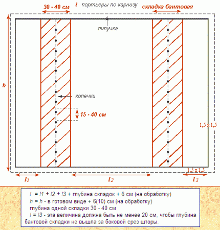 Une fois la taille du produit fini déterminée, nous calculons la quantité de tissu. Pour un dessin avec deux plis, ajoutez au moins 60 à 90 cm à la largeur. Cet "excès" déterminera le volume de l'arc et la profondeur du pli.
