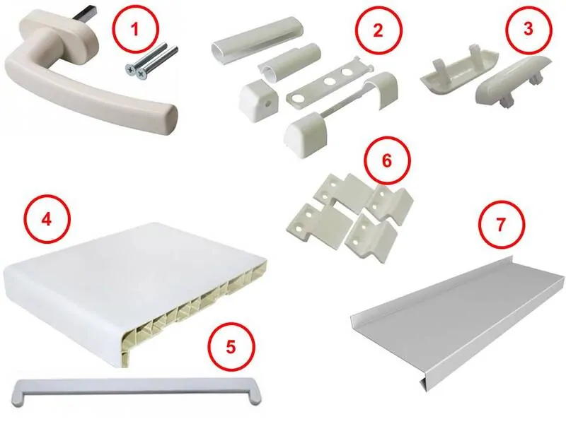 Photo: 1 - poignée de fenêtre avec vis; 2 - un ensemble de superpositions décoratives pour charnières; 3 - bouchon de vidange (par pièce); 4 - rebord de fenêtre; 5 - bouchon de rebord de fenêtre (un pour chaque rebord de fenêtre); 6 - un ensemble de fermetures pour une moustiquaire; 7 - marée basse