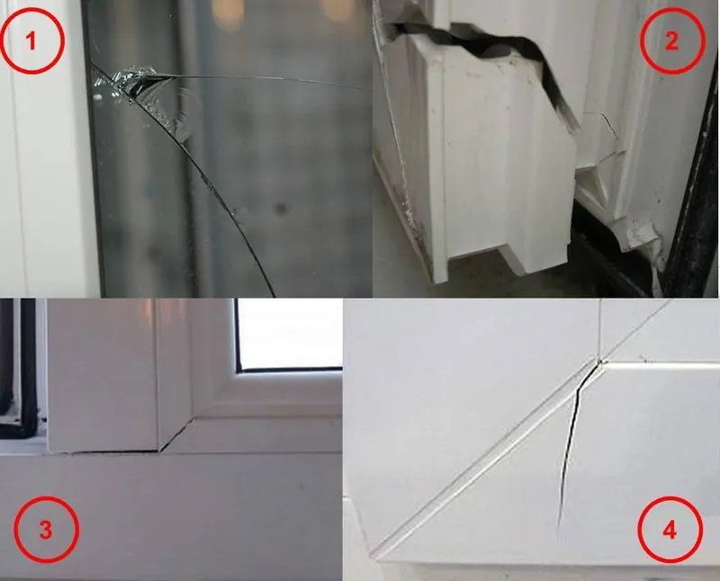 Photo: tout dommage mécanique à la fenêtre, tel que des fissures dans le vitrage (1), des éclats de profil (2), des interstices au niveau des joints des profilés (3), des fissures dans les coins (4) sont inacceptables. Nous renvoyons immédiatement une telle fenêtre.