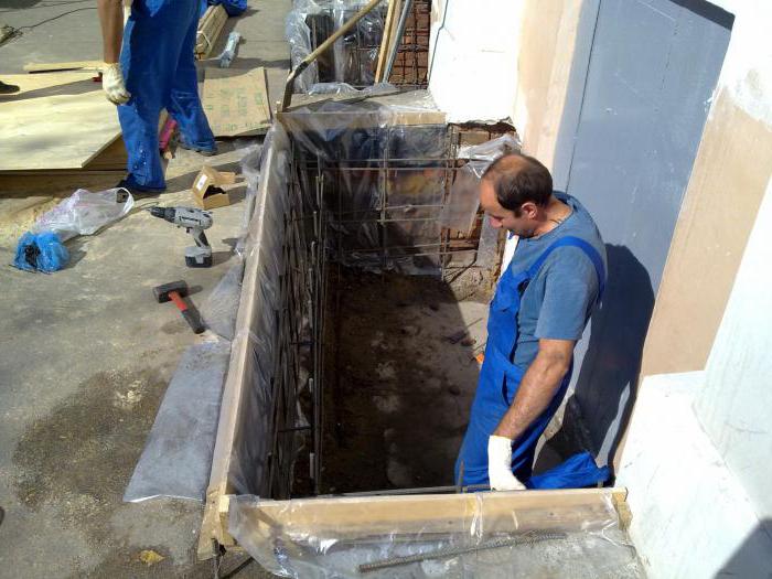 Une fosse est creusée selon un projet préparé. Le coffrage de planches est installé. Si la configuration est complexe, des panneaux de fibres de bois ou des panneaux en plastique sont utilisés pour le coffrage. Les parois de la fosse sont renforcées avec des renforts - avec des tiges ou des grilles. Les murs sont formés en premier, et seulement ensuite le fond!