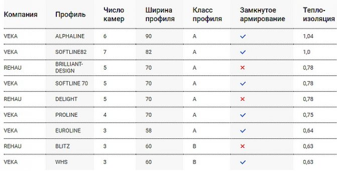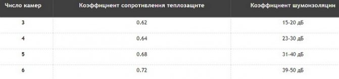 | Marque de profil et sa classe | Nombre de chambres internes | Épaisseur maximale du vitrage (mm) | Coefficient de résistance au transfert de chaleur, à condition que l'armature en acier soit utilisée (W / m2°C) |