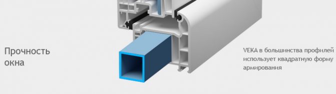 Le renfort métallique dans le cadre assure la rigidité de la fenêtre métal-plastique. Selon les normes, une armature en acier galvanisé d'une section fermée (carrée) d'une épaisseur de 1,5 mm est installée dans le profilé de cadre Veka.