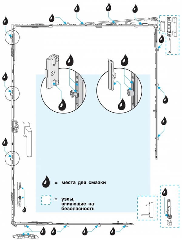 Les fabricants donnent une garantie pour les raccords de 2 à 5 ans. Pour une telle période, en règle générale, il y a suffisamment de lubrifiant d'usine (mais cela dépend toujours des conditions de fonctionnement). Après son expiration, il est nécessaire de mettre à jour. Les experts conseillent de le faire au moins une fois par an (la saison recommandée est la mi-printemps). Les résidents des grandes villes devraient le faire plus souvent. Si les fenêtres font face à la route, les ferrures se saliront plusieurs fois plus rapidement en raison de l'abondance de poussière et de smog.