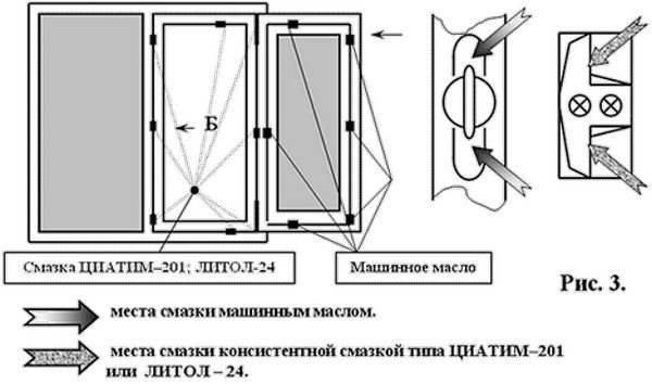 Tous les composants des systèmes de fenêtres jouent un rôle dans leur bon fonctionnement, mais les ferrures nécessitent un soin particulier en termes de soins. Les pièces métalliques mobiles sont nettoyées de la poussière et de la saleté avec une brosse ou un aspirateur, puis lubrifiées avec de l'huile de machine. Cette opération est répétée à intervalles de 1 à 2 fois par an au printemps et en automne. Si la fenêtre est ouverte ou fermée avec force, il est nécessaire de dévisser les boulons de fixation de la poignée et de lubrifier son mécanisme interne.
