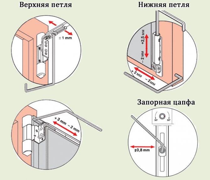 - Le mouvement de haut en bas de l'ouvrant est effectué à l'aide d'une vis située sur l'extrémité supérieure de la charnière inférieure. Il y a aussi une prise, elle doit être retirée et ajustée. Lorsqu'il est tordu dans le sens des aiguilles d'une montre, la ceinture monte et contre elle - vers le bas.
