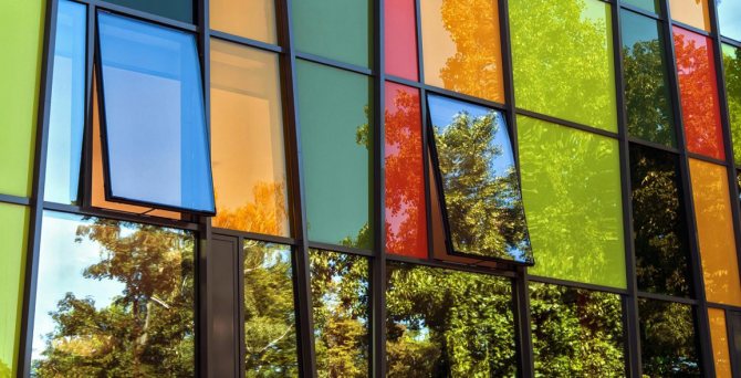 - Le revêtement de protection solaire pulvérisé d'oxyde métallique a une surface semblable à un miroir et vous permet de limiter l'accès du soleil à la pièce. Une fonction similaire est remplie par le verre peint, par conséquent, pour se protéger du soleil, il sera justifié d'inclure un élément de vitrail dans l'unité de verre.