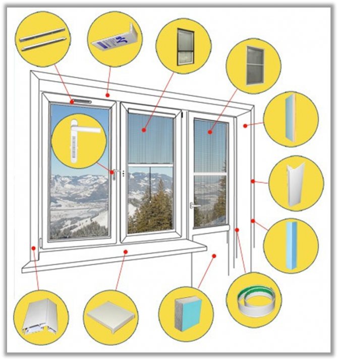 - Accessoires supplémentaires - appuis de fenêtre, pentes, poignées, reflux, charnières, moustiquaires, parcloses, une soupape d'admission.