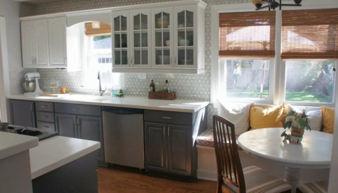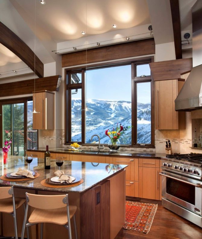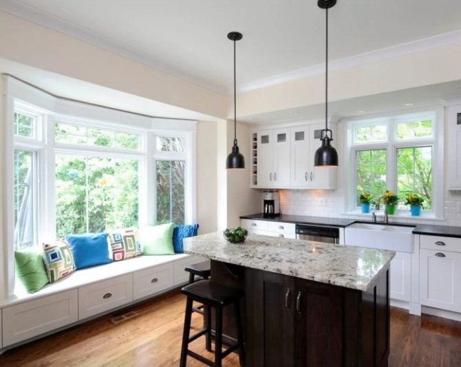 Lors de la planification d'une cuisine, vous pouvez expérimenter et installer des fenêtres panoramiques sur la zone de cuisson. Et si vous montez correctement le comptoir, la taille de la zone utilisable augmentera complètement.