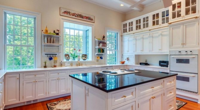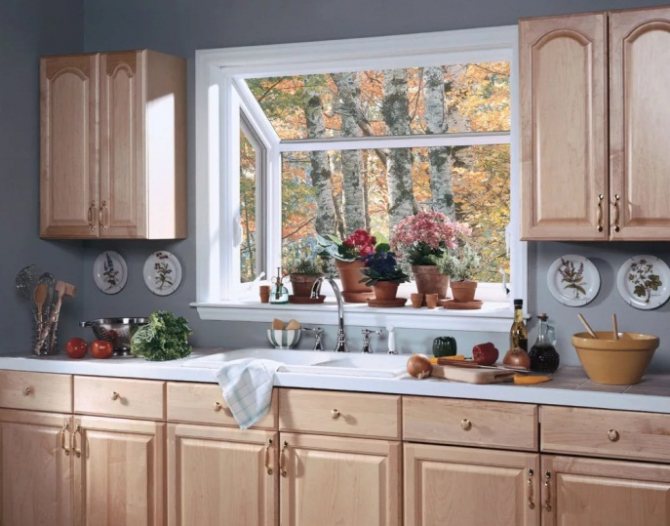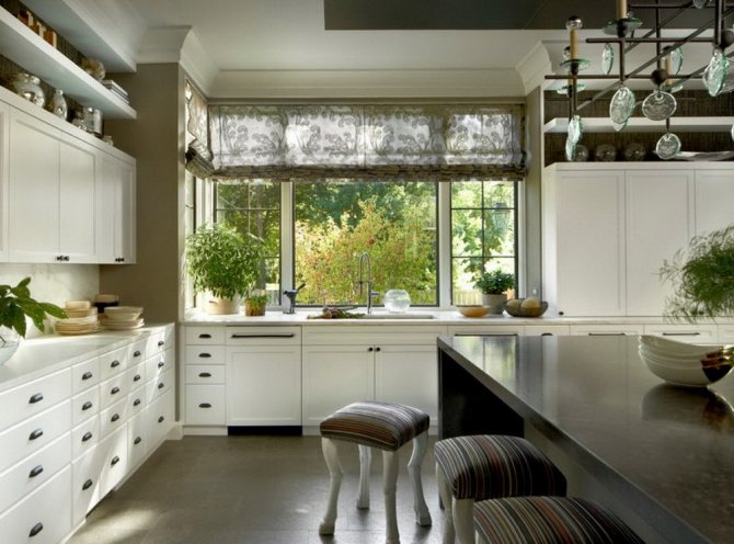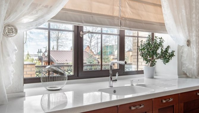 Dans la cuisine, il est préférable de placer les fenêtres à une hauteur de 80-90 centimètres, idéalement au niveau du futur ensemble de cuisine. Ensuite, il s'avérera que la zone de travail augmentera au détriment du rebord de la fenêtre.