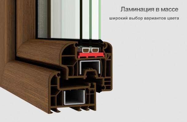 - Lamination en vrac - la couleur est donnée au stade de la fabrication, et un film protecteur est appliqué à la surface de l'élément pour le protéger du soleil. Le coût d'une telle fenêtre est de 14 à 21 000 roubles.