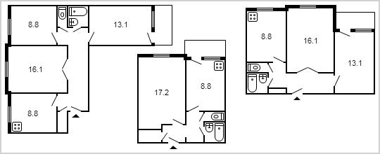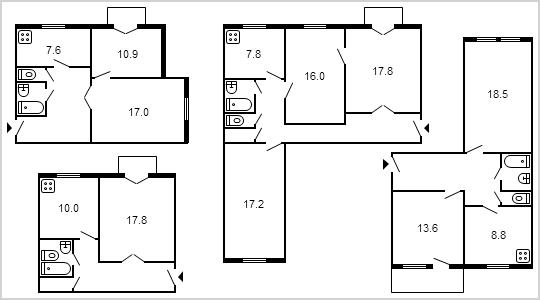 | P-30, à partir de panneaux, 12-13 étages, avec des murs épais | 208*142 147*142 | 87*142 | 70*218 |