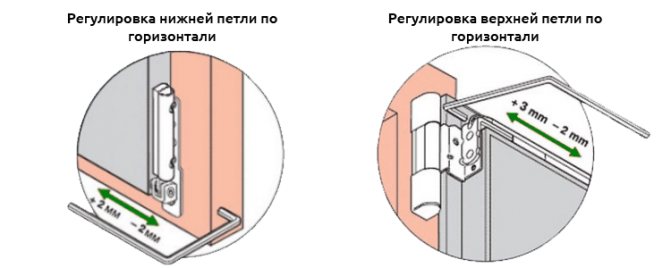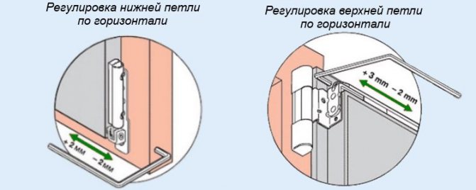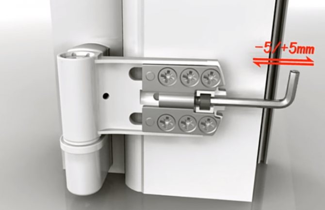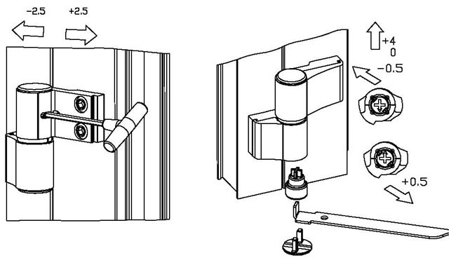 Ce type de réglage consiste à déplacer le châssis parallèlement au haut et au bas de la structure. La porte peut s'accrocher au sommet près du pilier porteur ou au seuil à côté du montant opposé. La bande est également sensible à la dilatation thermique, ce qui exacerbe les problèmes ci-dessus. Pour effectuer des réglages, vous avez besoin d'une clé à 6 pans de 4 mm, moins souvent d'un autre outil. La vis d'alignement horizontal est positionnée horizontalement de la même manière. Pour terminer la tâche, ouvrez la porte, insérez la clé dans le trou et tournez-la. La rotation dans le sens des aiguilles d'une montre tirera la courroie vers la charnière et soulèvera le bas du panier opposé. Déplacer l'outil dans l'autre sens sera contre-productif. S'il est nécessaire d'éliminer l'écrasement ou de niveler les conséquences de la dilatation thermique, il sera alors nécessaire d'influencer toutes les charnières de porte.