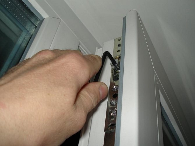 Il est préférable d'ajuster la hauteur de la lame immédiatement après avoir remarqué une rugosité ou des bosses sur les joints. Pour changer la position de la toile, vous devrez resserrer la boucle de charnière inférieure. Les actions sont effectuées selon un algorithme spécifique. Tout d'abord, nous accédons aux vis de réglage de la charnière inférieure. Ils sont généralement cachés sous une bande décorative. Cet élément est supprimé en se déplaçant vers lui-même et vers le haut. Nous effectuons l'action avec soin, car au fil du temps, le plastique a tendance à se dessécher et à se fissurer. Ensuite, nous travaillons avec la vis de réglage vertical. Nous envoyons une clé hexagonale de la taille souhaitée (généralement 4 mm) dans la tête. Ensuite, nous le faisons pivoter. Les mouvements dans le sens des aiguilles d'une montre soulèveront l'ouvrant et les mouvements inverses l'abaisseront. Certains fabricants de portes ont un astérisque au lieu d'un trou hexagonal.