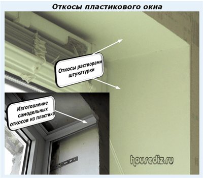 La photo intégrée montre l'étape de la création de pentes avec vos propres mains en plastique et à l'extérieur - avec du mortier de plâtre ordinaire.Ils ferment la fenêtre de l'intérieur de la pièce, lui donnant un aspect décoratif.