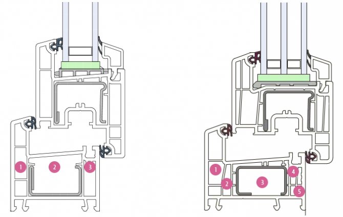 La cavité dans le plastique, divisée par des cloisons, est une chambre profilée. Le profil a au moins 3 caméras. Le central permet de renforcer le système, les raccords sont fixés sur les autres, le condensat en est évacué. En outre, les chambres extérieures fournissent le niveau nécessaire de protection contre le bruit et la chaleur.