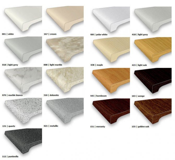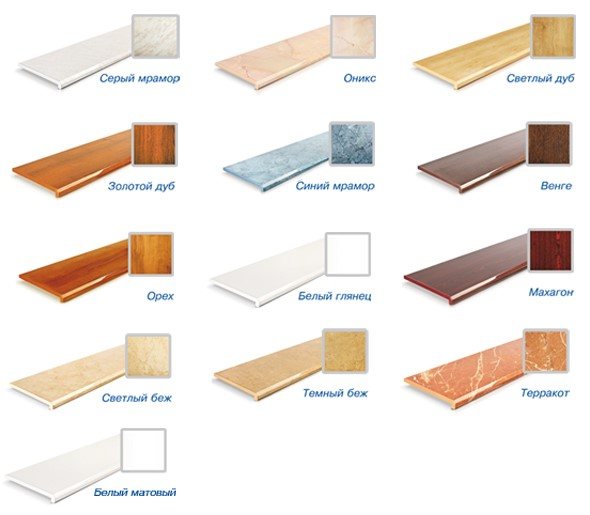 Les surfaces des modèles en aggloméré, MDF et composite ont une riche palette de couleurs - du blanc au brun foncé. Les appuis de fenêtre pour fenêtres en plastique en pierre naturelle peuvent être achetés dans des tons clairs, crème, gris et chocolat noir.La pierre artificielle a un très large choix de compositions de couleurs variées. Les modèles en béton et autonivelants peuvent être en blanc, beige, gris et mélange.