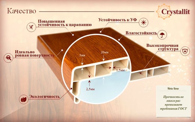 La base prise par les fabricants est en PVC rigide, recouvert d'un film acrylique Elesgo. Les produits ont une structure solide avec des parois épaisses, grâce auxquelles le matériau ne change pas ses propriétés physiques au fil du temps.
