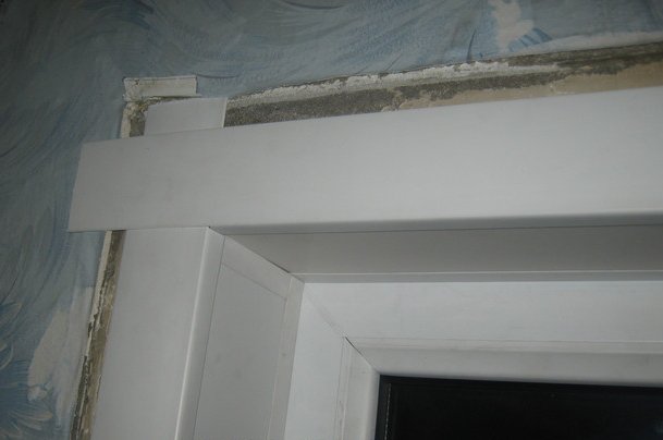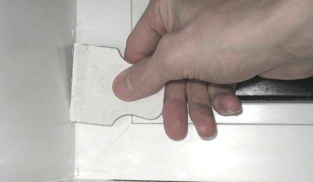 Maintenant, vous devez mesurer et scier le coin, alors qu'il devrait dépasser la fenêtre de 5 à 6 cm (de chaque côté). La partie intérieure du coin doit être ajustée de manière à pouvoir adhérer particulièrement étroitement aux pentes latérales. Travailler avec les coins latéraux vous demandera également de laisser une marge. Les coins doivent être enclenchés avec précaution afin qu'ils n'éclatent pas accidentellement entre vos mains. Après avoir fixé les coins, nous prenons un couteau et coupons le plastique le long du guide.