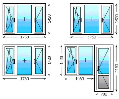 - vitrage de balcon - 2500 × 1500 mm (droit), 800-1000 × 1500 et 2500-2800 × 1500 mm (en L), 5 modules 750 × 1500 mm (fenêtre en baie).