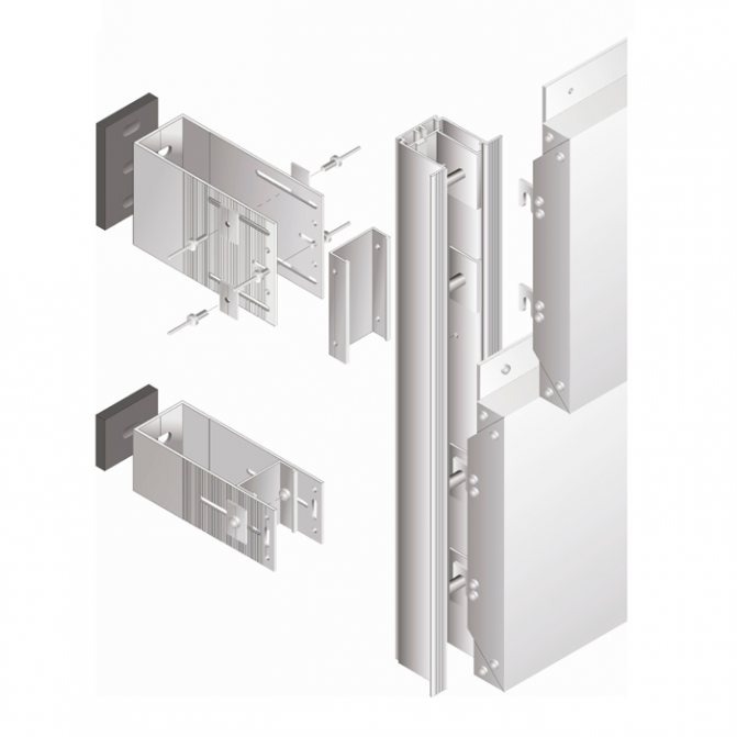 Les éléments de façade (cadres, piliers) sont fixés aux éléments structurels du bâtiment à l'aide d'ancrages spéciaux en aluminium ou en acier. Leurs pièces sont fixées du côté de l'extrémité des racks aux murs, plafonds, structures métalliques par soudage, chevilles ou ancrages. Les éléments en acier qui entrent en contact avec des pièces en aluminium doivent être entièrement galvanisés.Si des revêtements d'apprêt sont utilisés conformément à GOST 21519-84, ils sont isolés des pièces en aluminium. Les barres transversales et les crémaillères sont reliées les unes aux autres à l'aide de profilés spéciaux en aluminium intégrés.