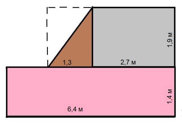 Avant de calculer la superficie de la pièce, nous apportons également des modifications. Seulement dans ce cas, il n'y aura pas deux chiffres, mais quatre: la longueur et la largeur de la saillie seront également ajoutées. Les dimensions des deux pièces sont calculées séparément.