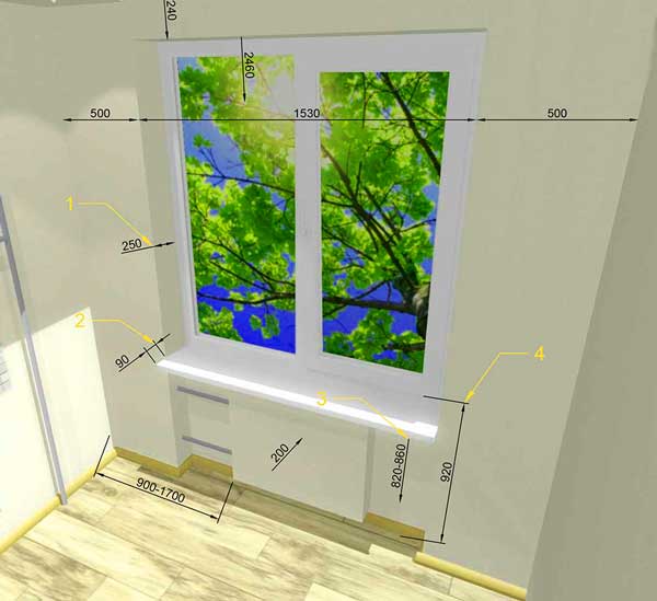 La largeur du rebord de la fenêtre dépend directement de la largeur de l'ouverture de la fenêtre. Une condition importante est la suivante : le rebord de la fenêtre ne doit jamais recouvrir complètement les radiateurs servant à chauffer la pièce. La longueur de la marée basse dépend de la largeur du côté rue de l'ouverture, à laquelle il faut ajouter 60-80 mm. Largeur de la marée basse - la distance entre le bord de la marée basse et le cadre de la fenêtre. Cette option est possible lorsque le reflux dépasse d'environ 30-50 mm du bord extérieur du mur de la maison. La longueur du rebord de la fenêtre est la longueur totale de l'ouverture de la fenêtre + 100-110 mm de chaque côté.