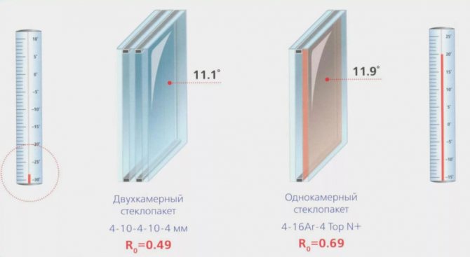 Un double vitrage a un taux de rétention de chaleur 1,5 fois plus élevé, la buée n'est observée qu'en dessous de -20 degrés. Cela se produit parce que le verre extérieur se refroidit à cause de l'air ambiant, la température dans les chambres diminue derrière lui, puis le verre intérieur se refroidit et des gouttes se déposent dessus. Plus de couches dans un sandwich augmenteront la température à laquelle l'humidité apparaît à la surface.