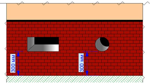 Afin de déterminer la hauteur à laquelle les bouches d'aération doivent être situées, il est nécessaire de savoir à quelle hauteur le premier étage sera surélevé par rapport à la surface de la terre. La distance minimale entre la surface du sol et le bord inférieur de l'évent doit être d'au moins 300 mm. Si ce trou est placé plus bas, il est possible que l'eau de fonte au printemps et l'eau de pluie tombent dans le sous-sol à l'automne.