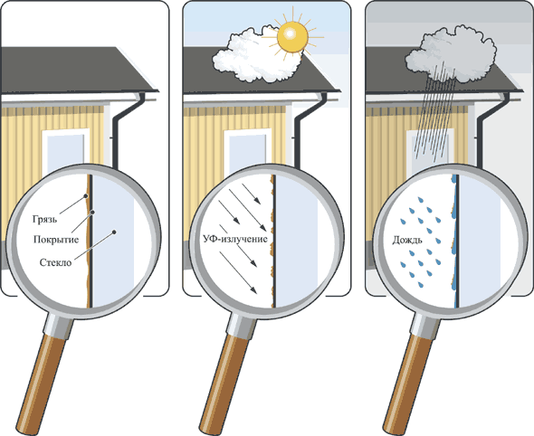 Le verre A semble inhabituel, même dans le contexte des précédents. La pulvérisation à base d'oxyde de titane, appliqué sur sa surface, permet de nettoyer le verre des contaminants organiques sans intervention humaine. La pulvérisation est appliquée sur la surface du verre, qui n'a pas encore refroidi après la production, ce qui garantit l'adhérence la plus fiable. Lorsque les rayons UV atteignent le verre A, la pulvérisation démarre le processus de décomposition de tous les contaminants organiques. Ceux-ci comprennent les polluants d'origine humaine ou artificielle (gaz d'échappement, produits de combustion), ainsi que les polluants naturels (sol et particules de poussière). La pluie qui s'est écoulée après cela n'aura qu'à laver la saleté fendue de la surface du verre. Après cela, aucune strie ne se forme. On peut dire que le verre A se lave littéralement tout seul. Mais cela ne signifie pas que vous n'avez pas du tout besoin de laver un tel verre. Vous avez juste besoin de le faire beaucoup moins souvent.