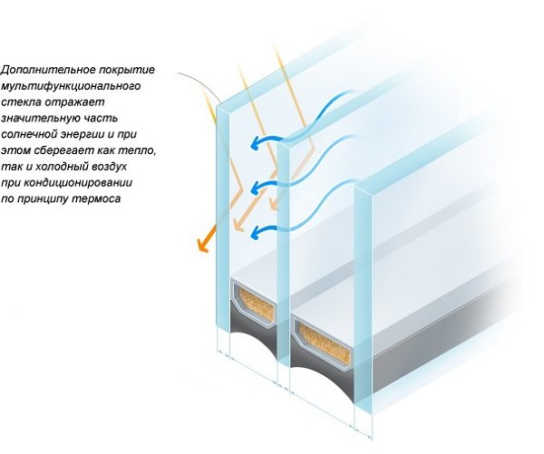 Il s'agit d'un vitrage isolant multifonctionnel - verre revêtu, qui est appliqué dans une installation magnétron sous vide de manière industrielle. Les couches les plus minces d'oxyde d'argent et d'autres métaux sont appliquées au verre ordinaire sous l'influence d'un champ électromagnétique. La principale différence entre le verre multifonctionnel et le verre à économie d'énergie (économie de chaleur) réside dans le nombre et la composition des nanocouches appliquées sur la surface. Dans le verre à économie d'énergie, il s'agit d'une couche d'oxyde d'argent, et dans le verre multifonctionnel, il y a plusieurs couches de différents métaux.