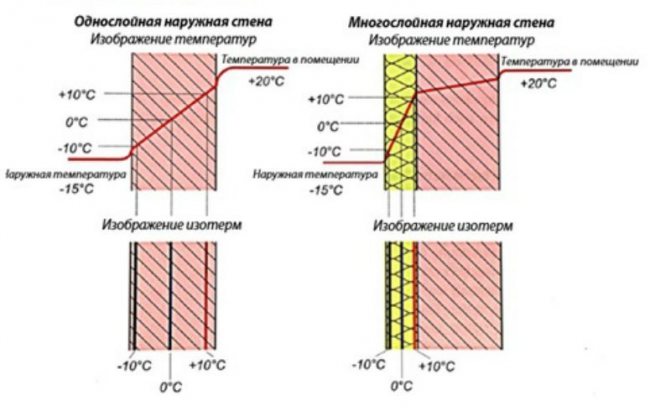 Dans la construction, des exigences réglementaires sont fixées pour la quantité de flux de chaleur à travers le mur et à travers elle déterminent son épaisseur. L'un des paramètres de son calcul est la différence de température à l'extérieur et à l'intérieur de la pièce. La période la plus froide de l'année est prise comme base. Un autre paramètre est le coefficient de transfert de chaleur K - la quantité de chaleur transférée en 1 s sur une surface de 1 m 2, lorsque la différence de température entre l'environnement externe et interne est de 1 ºC. La valeur de K dépend des propriétés du matériau. Au fur et à mesure qu'elle diminue, les propriétés de protection thermique du mur augmentent. De plus, le froid pénétrera moins dans la pièce si l'épaisseur de la clôture est plus grande.