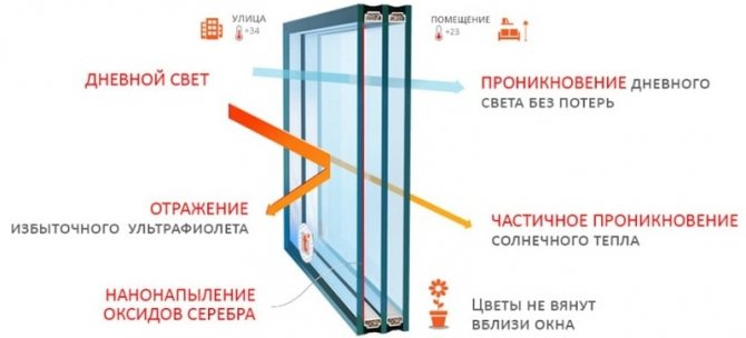 - Crème solaire... Enregistre l'intérieur des rayons du soleil brûlants, augmente le confort dans la pièce. Le verre "absorbant" avec protection solaire est peint dans la masse, "réfléchissant" - revêtu d'un revêtement spécial. La deuxième solution de coût comparable est plus efficace.