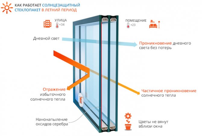 L'essence de ces fenêtres à double vitrage est que la couche la plus mince d'oxydes métalliques, principalement d'argent, est pulvérisée sur du verre flotté ordinaire. Des ondes de rayonnement électromagnétique y sont réfléchies.