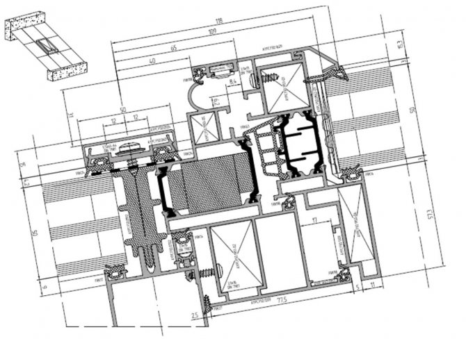 Dans les profils de cadre et de châssis, des ponts thermiques en polyamide 34 sont utilisés. Les pieds des ponts thermiques permettent de créer un espace à plusieurs chambres dans la zone d'isolation du châssis, la chambre d'isolation thermique du châssis est remplie d'inserts en mousse constitués d'un matériau à faible conductivité. Le joint intermédiaire FRK64 a un corps massif avec plusieurs chambres, ce qui crée une barrière sérieuse dans l'espace entre le cadre et le châssis. Tout ceci a permis d'augmenter significativement les propriétés thermophysiques de la trappe et d'obtenir la conductivité thermique de l'assemblage profilé «poteau avant et ouvrant de trappe» au niveau de Uf = 1,979 W / (m2 · ° K).