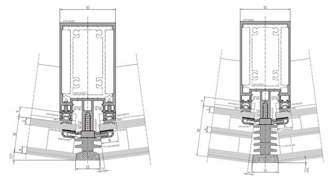 - Le cadre est principalement fixé aux plafonds entre les étages, il n'est donc visible que de l'intérieur de la pièce, et seuls les panneaux de verre sont visibles de l'extérieur, séparés par des coutures étroites de 10 à 12 mm.