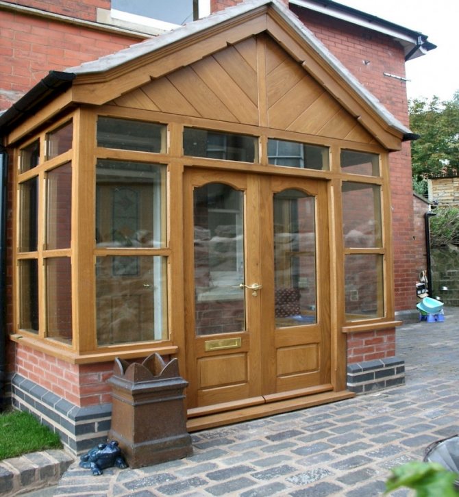 Un porche avec un vestibule peut être utilisé aux fins prévues (transition de la rue à un espace fermé de la maison) et comme espace supplémentaire pour ranger des choses ou se détendre pendant la saison chaude.