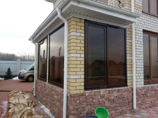 Tambour - auvent (version urbaine), relie la partie résidentielle de la maison aux buanderies. Le porche est situé entre les murs de la maison et le garage, à l'abri du vent. Dans les zones aux hivers enneigés, il est avantageux de placer un escalier pour monter au niveau du premier étage à l'intérieur de la verrière.