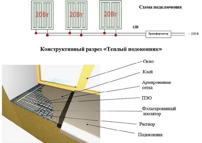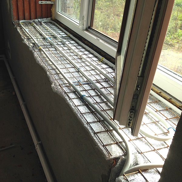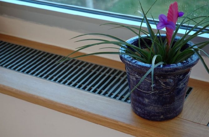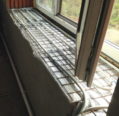 Une solution simple consiste à équiper la base de support d'un radiateur et à former 1 à 2 grilles de convection dans le rebord de la fenêtre. Une construction plus complexe et laborieuse, mais non moins efficace (et peut-être même plus) est un bloc de béton avec des éléments chauffants (éléments chauffants ou conduites d'eau).