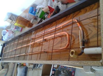 - Dans la forme résultante, à une distance d'au moins 1 cm du contreplaqué, un tuyau d'eau en cuivre de petit diamètre ou un fil chauffant électrique est posé. Vous pouvez corriger ces éléments de n'importe quelle manière pratique. Pour les tuyaux, une fixation pour tuyaux en polypropylène est utilisée.