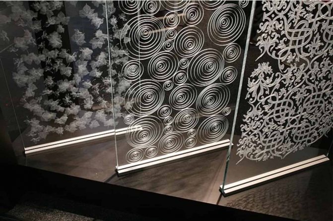 - Avec dessin. Des ornements géométriques, des dessins, des logos sont appliqués sur la surface du verre à l'aide d'un sablage, d'un film.