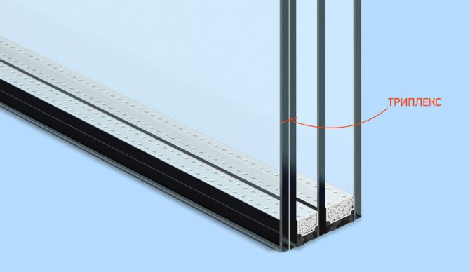 Triplex est une combinaison spéciale de plusieurs verres égaux (au moins deux). Un film (polyvinylbutyral) ou un composé de composition complexe est utilisé comme espaceur pour les couches de verre.
