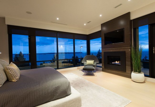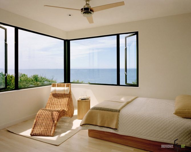 Les fenêtres d'angle dans la chambre seront appréciées par ceux qui aiment profiter de la lumière des étoiles ou des lumières du soir avant de se coucher, et le matin - pour rencontrer les premiers rayons de l'aube. Le lit de la chambre peut être placé directement dans le coin vitré, et pour que la lumière ne semble pas trop vive, les fenêtres doivent être fermées avec des rideaux sombres. La teinte des rideaux est choisie en fonction de la palette de couleurs de la pièce.