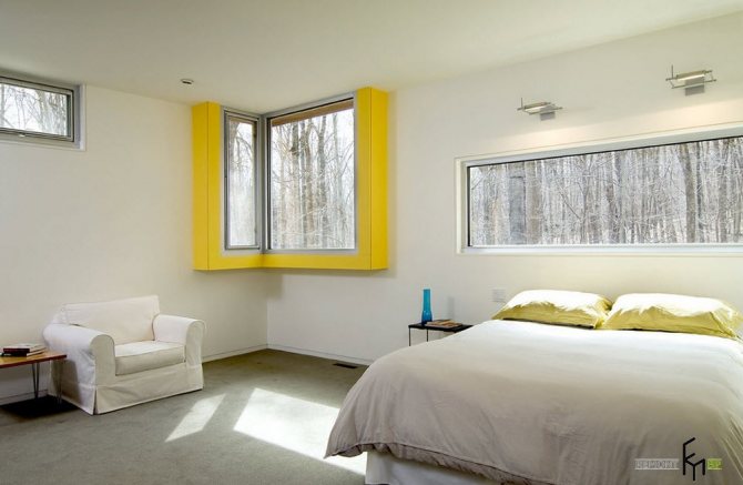 Comme dans n'importe quelle pièce, une fenêtre d'angle dans la chambre remplira la pièce de lumière naturelle, ce qui économisera sur les appareils d'éclairage. Dans la chambre, dont l'intérieur est fait dans le style du minimalisme, la fenêtre n'a pas besoin de décor supplémentaire: