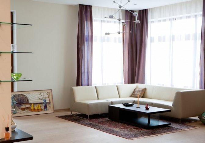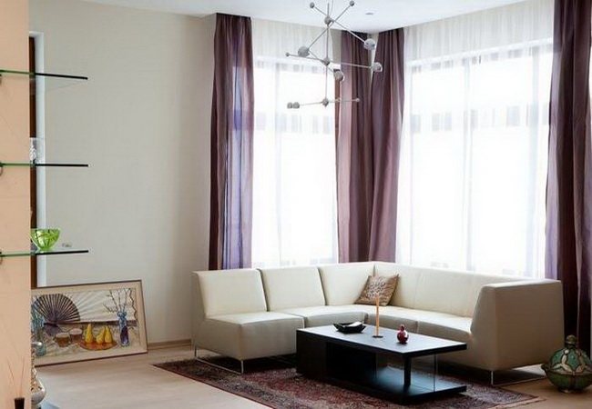 - Si le salon est petit, la présence de deux murs avec des fenêtres limite la possibilité d'organiser de grandes armoires, des vitrines et des toboggans.