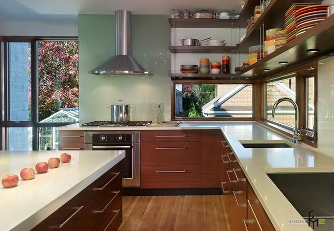 Parfois, une fenêtre d'angle dans la cuisine fait office de tablier.... Dans ce cas, des étagères pour épices et épices peuvent être suspendues au-dessus de la fenêtre, où leur accès sera toujours pratique et rapide. Il est à noter qu'une fenêtre au lieu d'un tablier est une solution assez pratique, car la surface du verre est la plus facile à entretenir.
