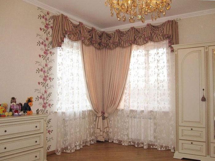 - Les fenêtres panoramiques dans le coin de la maison sont mieux décorées avec 2 rideaux droits identiques, combinés en 1 composition entière à l'aide d'un lambrequin et de 2 rideaux décoratifs épais aux coins des ouvertures.