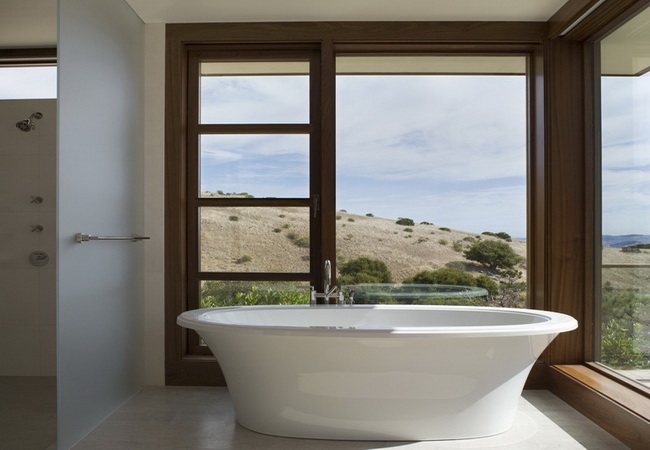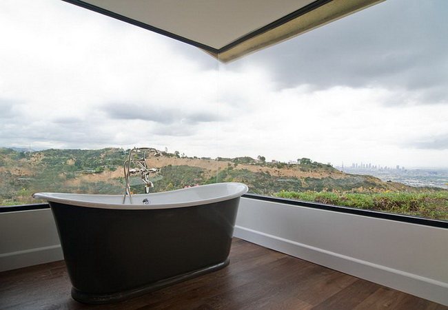 Dans la conception de salle de bain, une fenêtre d'angle peut devenir accent central de l'intérieur, parfois il n'a même pas besoin d'être complété par d'autres détails. Si la chambre est située aux étages supérieurs de l'immeuble, une excellente vue sur la ville ou la nature s'ouvrira à travers la fenêtre panoramique.