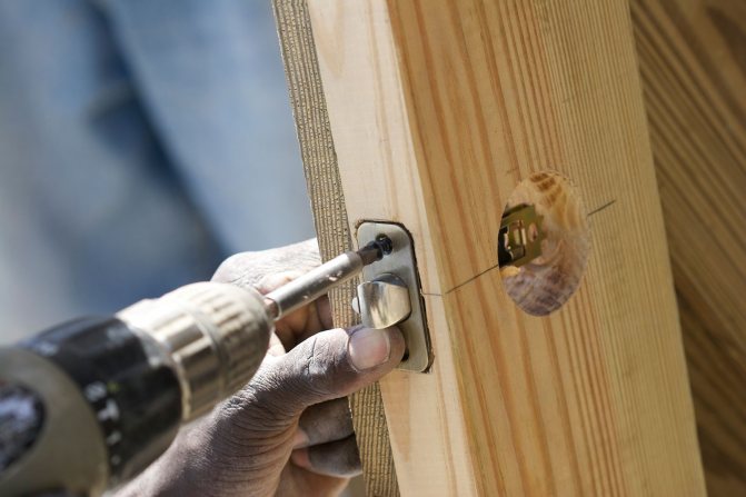Une autre étape importante est l'insertion de boucles. Ils sont fixés en deux pièces à une distance de 200 à 250 mm de chaque bord. Ils appliquent une pièce, dessinent les contours, découpent un évidement au ciseau, réappliquent les boucles et les fixent avec des vis autotaraudeuses.