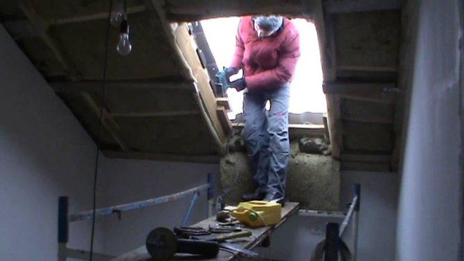 - L'isolant est découpé, laissé isoler les extrémités, l'imperméabilisation est simplement repliée. Le lattage et la base solide sont découpés à une distance de 20 cm du chevron. Le matériau de toiture est enlevé, laissant un espace de 5 cm de chaque côté par rapport à l'emplacement du cadre.